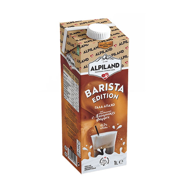 Το Alpiland Γάλα Barista ESL Άπαχο 0,2% είναι η υπέρ-ελαφριά επιλογή για κρύα ροφήματα, χωρίς να θυσιάζει τη γεύση ή την υφή. Από γάλα μικρών φαρμών στις αυστριακές Άλπεις, με τεχνολογία ESL για μεγαλύτερη διάρκεια ζωής, παραμένει φρέσκο και δροσερό για περισσότερες μέρες.